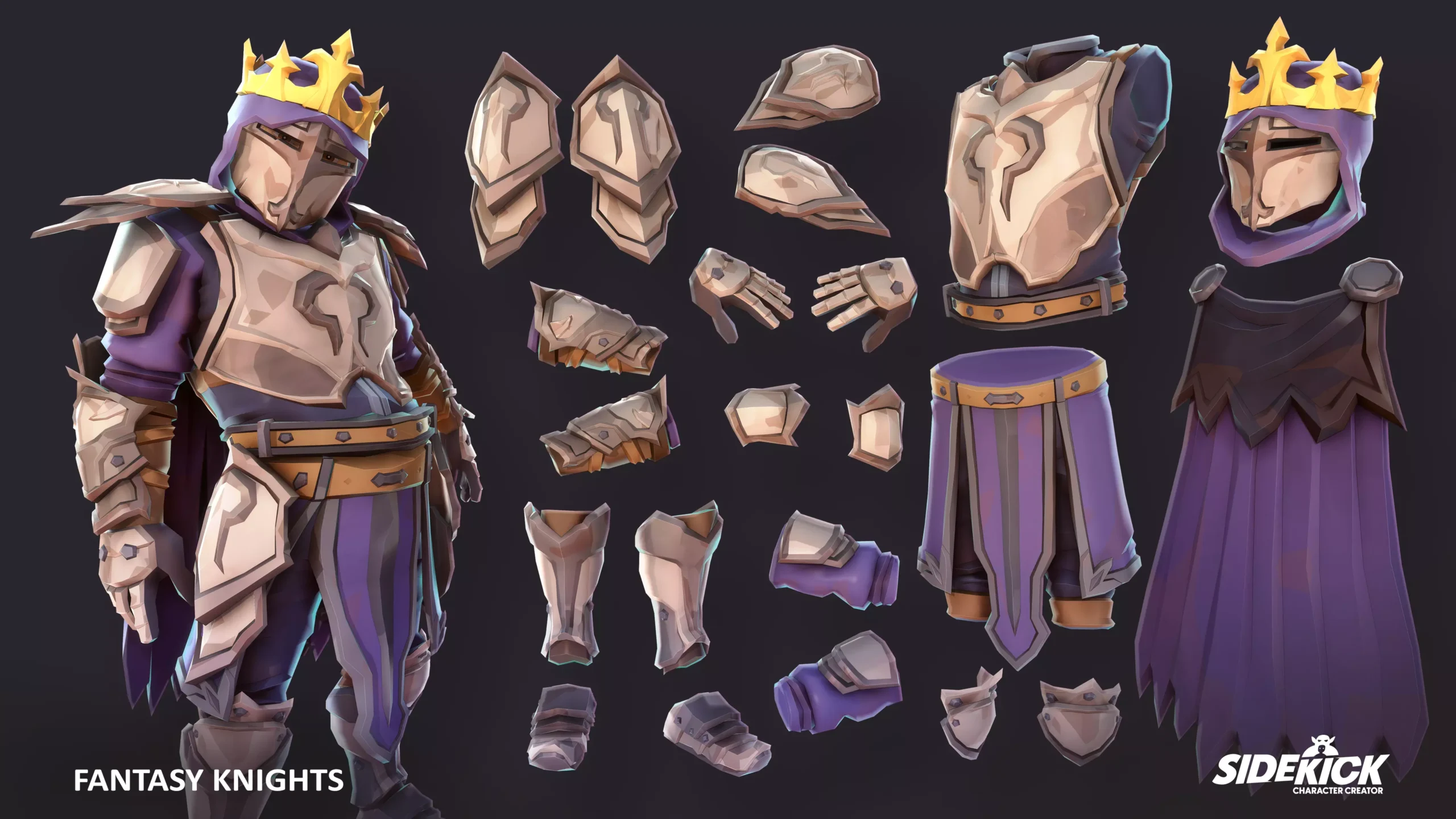 This Sidekick content pack puts a cavalry of brave Fantasy Knights into your character creation armoury! Ride into battle with over 100 brand new parts including broadswords, elaborate helmets, crowns, armour and more, designed to deliver just the noble knights your project needs.