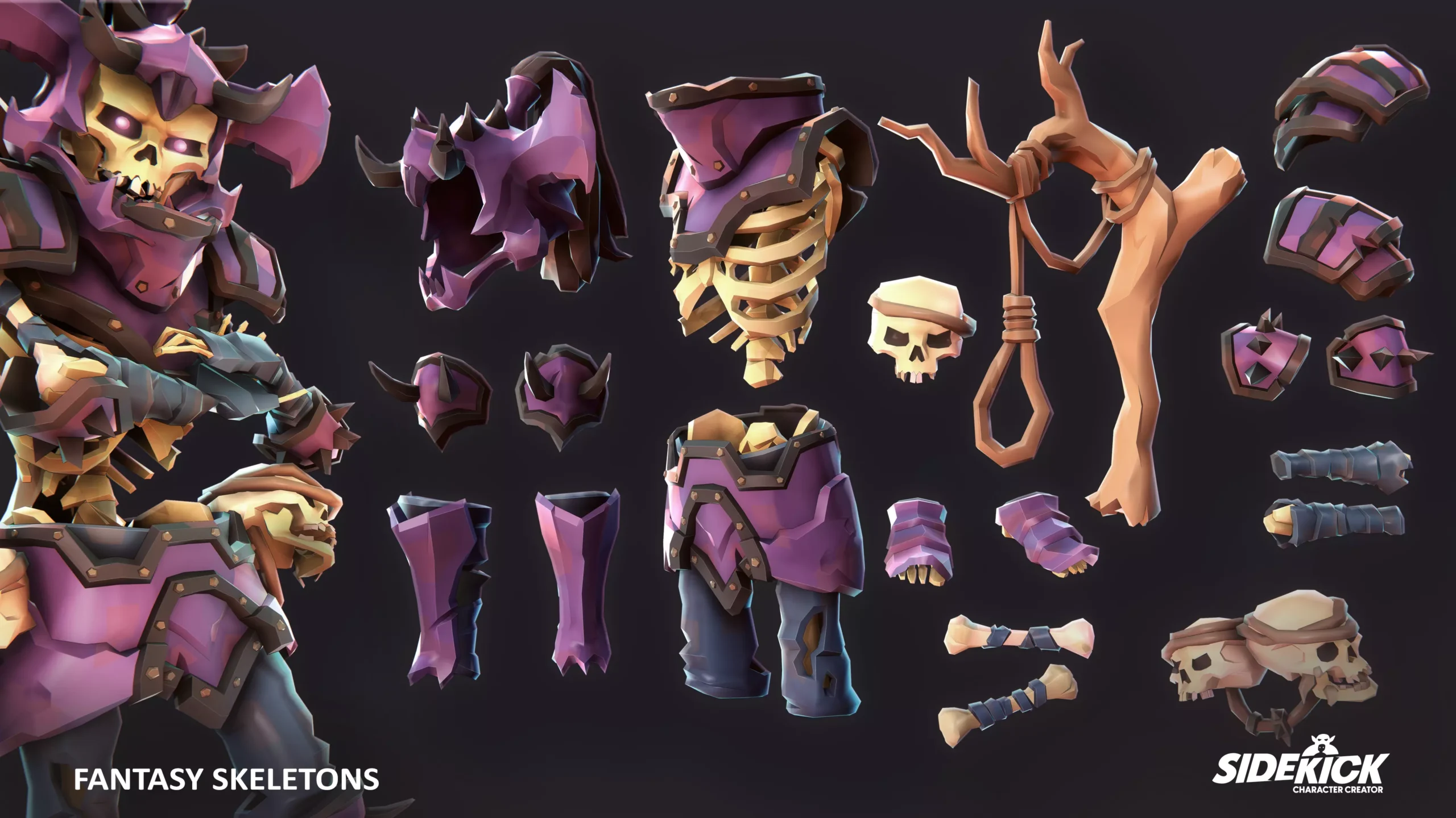 - 100+ modular, rigged Fantasy Skeleton parts (armour, helmets, gear and more)
