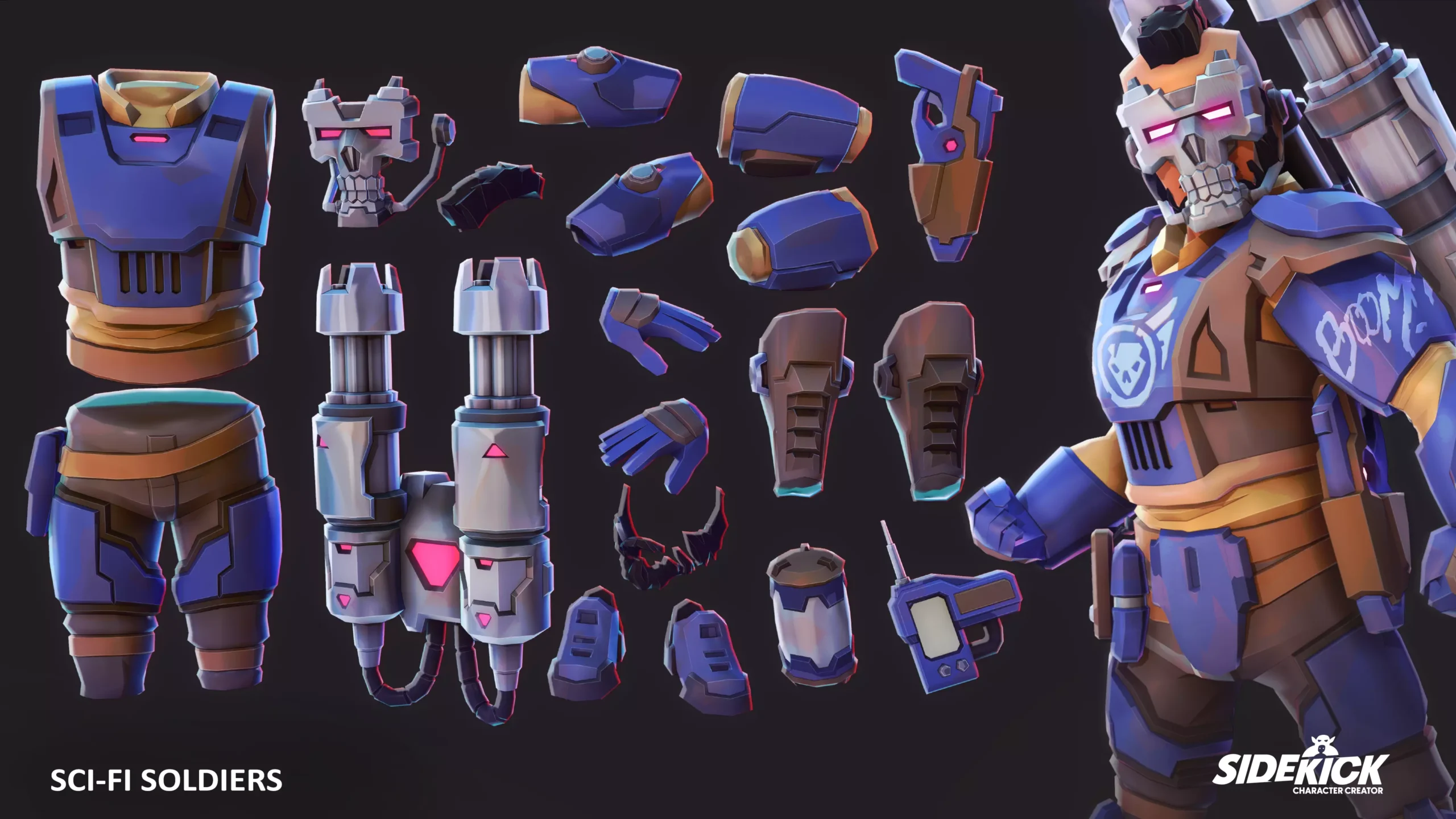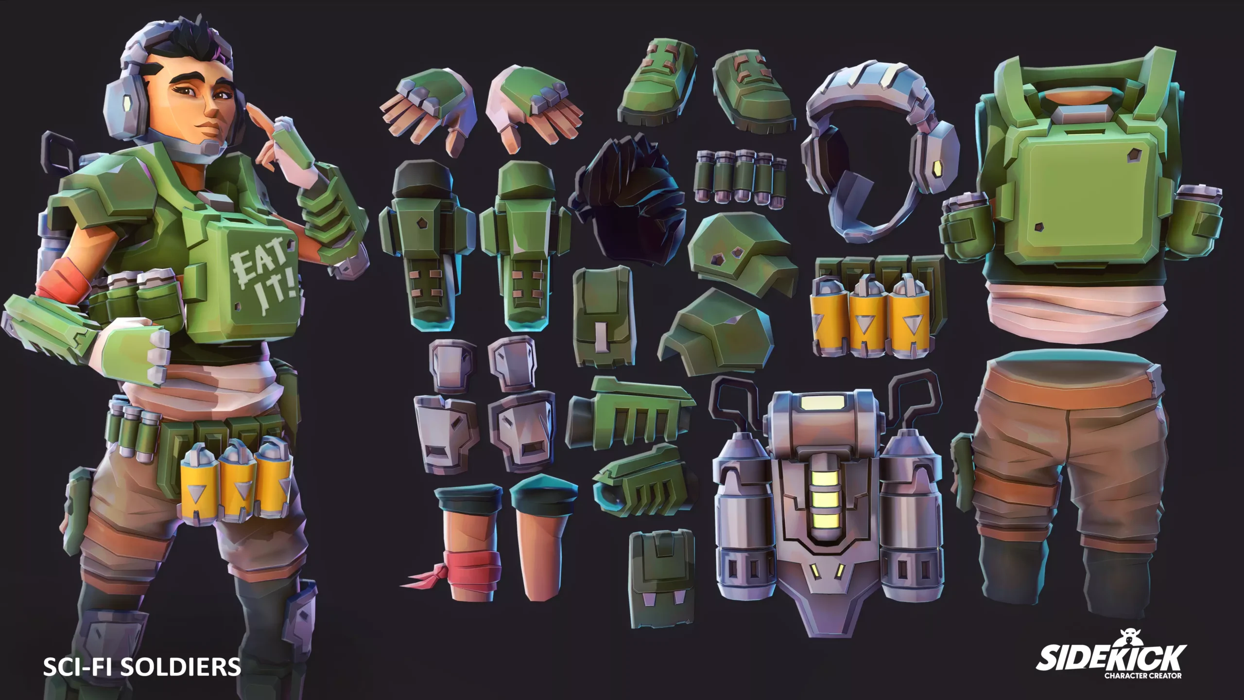 - 300+ modular, rigged Sci-Fi Soldier parts (helmets, hair, gear and more)