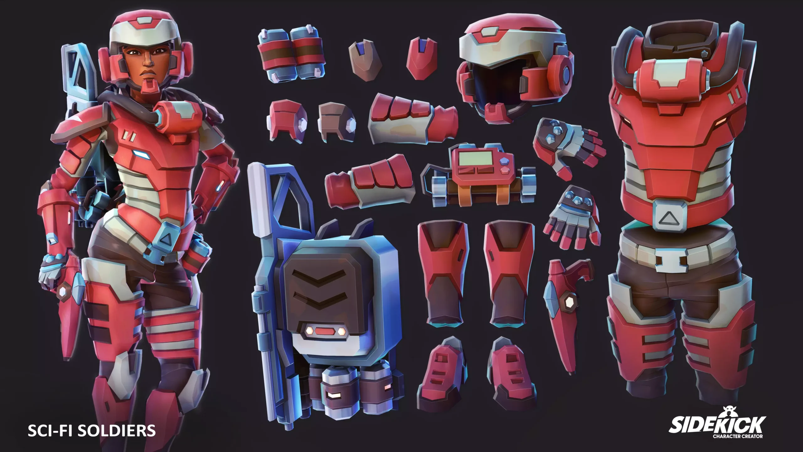 This Sidekick content pack puts a squad of elite Sci-Fi Soldiers into your character creation arsenal! Gear up for battle with 300+ character parts including helmets, armour, weapons, and more, designed to deliver the synthetic agents your project needs.